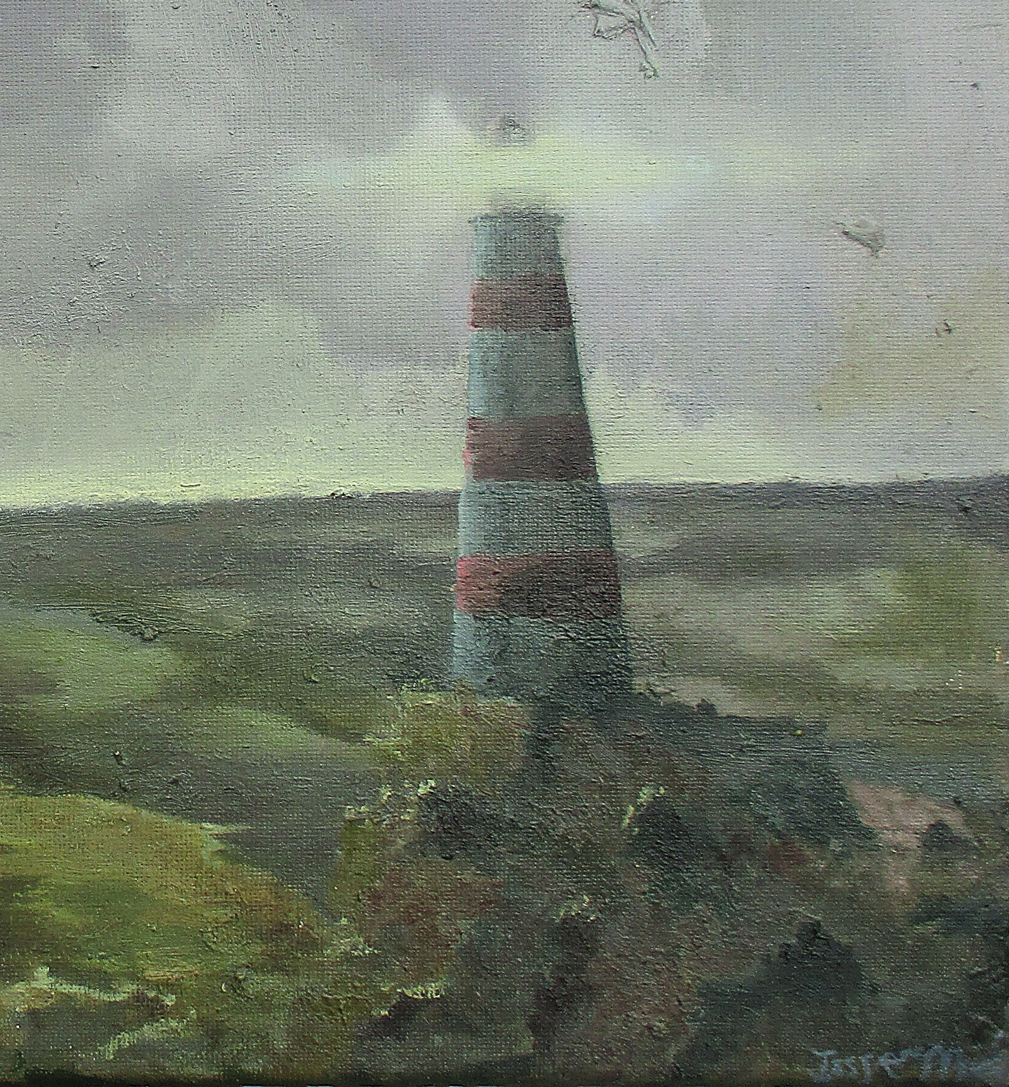 In the midst of a sprawling, desolate marshland, a solitary tower stands as a silent sentinel against the encroaching storm. The sky, heavy with dark, brooding clouds, casts a sombre pall over the landscape, while the tower's red and white stripes offer a stark contrast to the muted greens and browns below. This scene captures the raw, untamed beauty of nature, where the elements reign supreme and human presence is but a fleeting whisper.