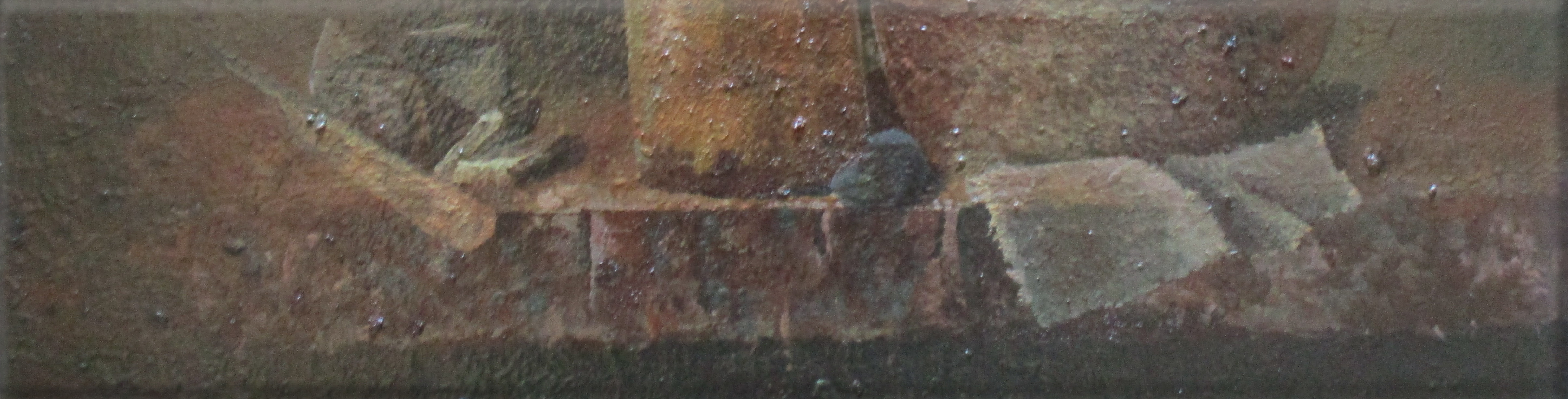 Shrouded Hills Hospitality is a still life that captures a humble collection of vessels—bottle, bowl, cup—set against a weathered backdrop that speaks of age and use. The subdued palette of ochres and umbers, paired with the rough surface and soft lighting, evokes a timeless domesticity. Each object, though ordinary, is rendered with reverence, inviting the viewer to linger in the quiet dignity of the everyday.