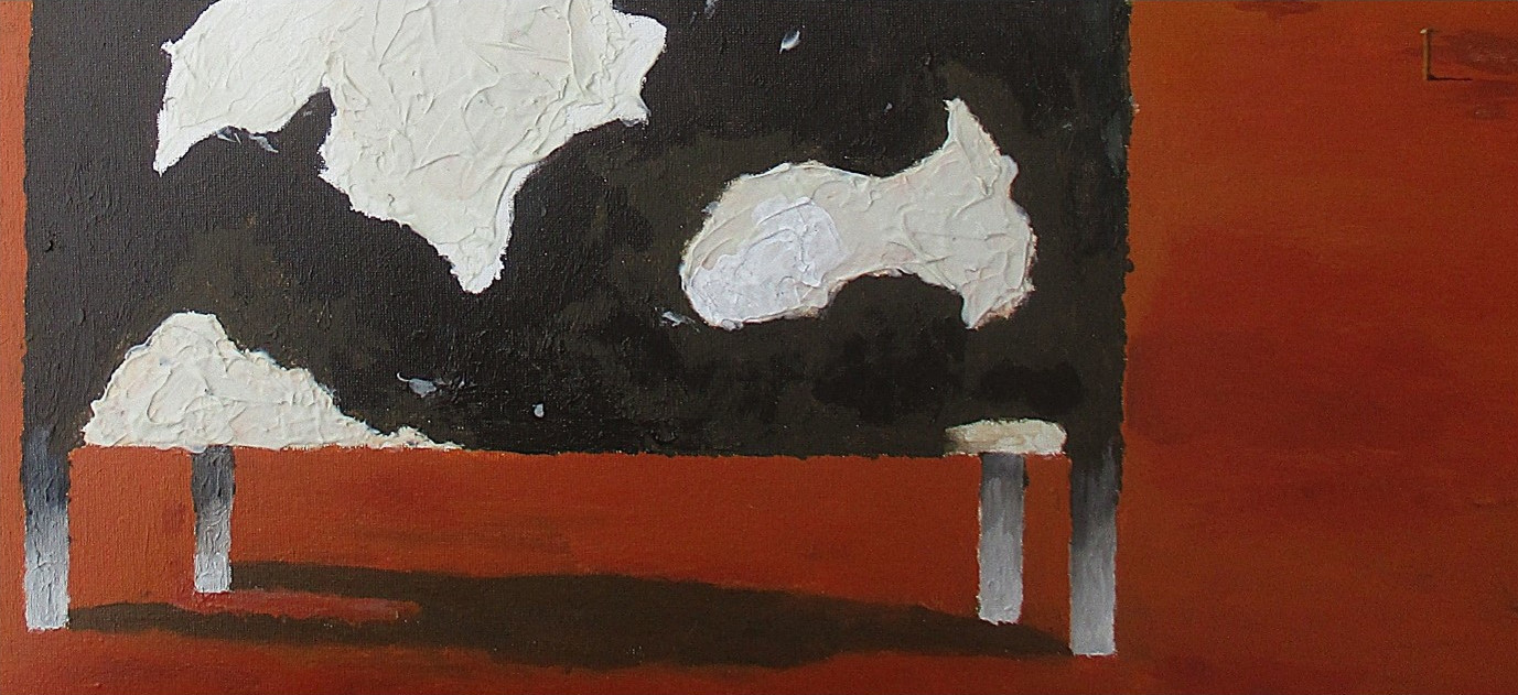 This painting is a portrayal of a cow, rendered with a blend of geometric simplicity and vibrant colour contrasts. The background is a division of warm, fiery orange and earthy brown, evoking a sense of both warmth and grounding. The cow itself is a bold, rectangular form, predominantly black with white patches, standing with an almost statuesque presence on slender, delicate legs.