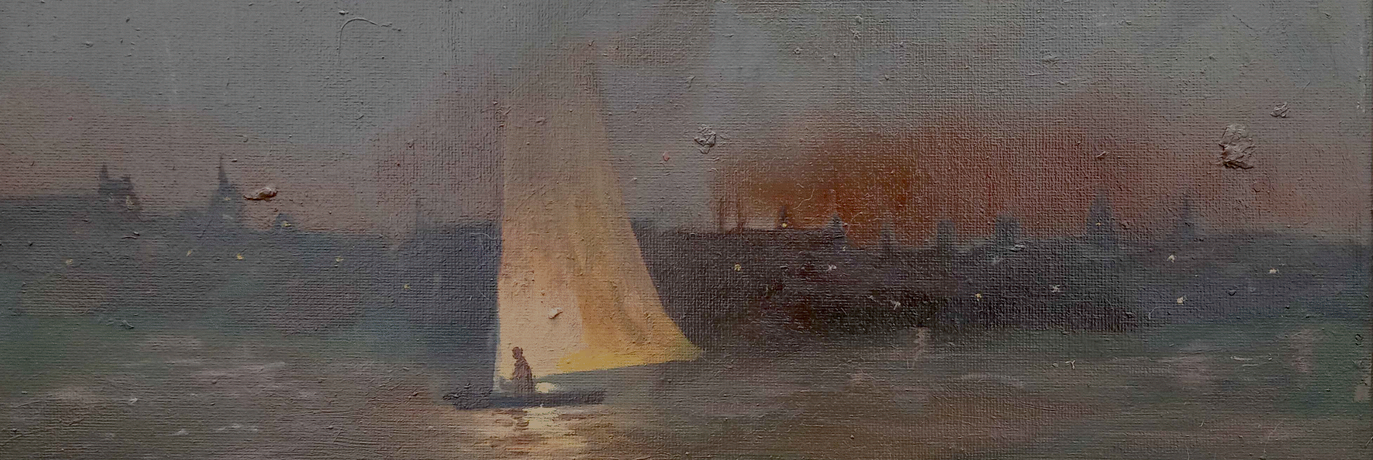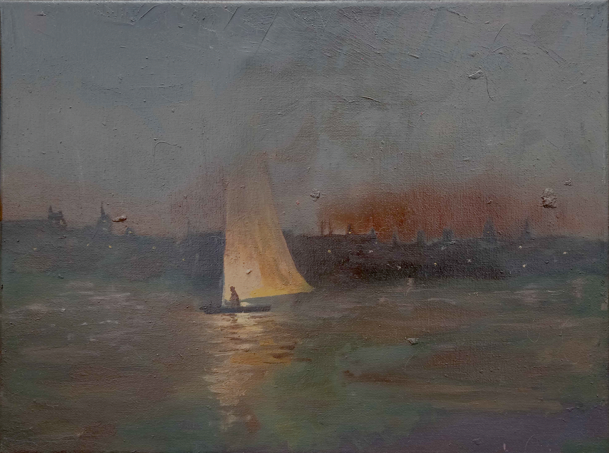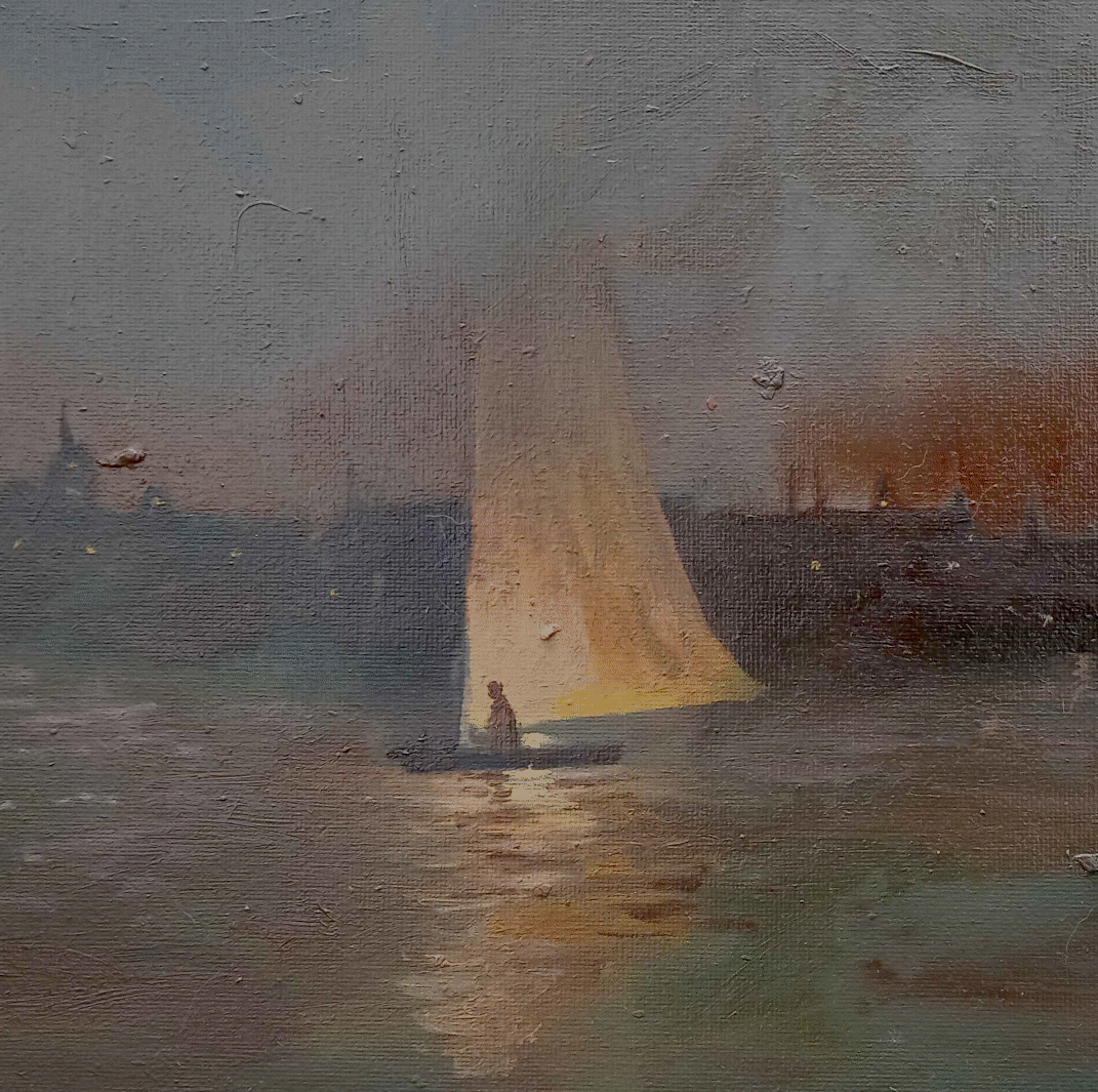 A serene and somewhat melancholic scene of a lone sailboat on a calm body of water during twilight or early dawn. The sailboat is illuminated by a soft, warm light, possibly from a lantern or the setting sun, casting a gentle glow on the water's surface. The background features a dark, indistinct shoreline with silhouettes of buildings and trees, shrouded in a misty or smoky atmosphere. The overall mood of the painting is tranquil and reflective, evoking a sense of solitude and quiet contemplation.